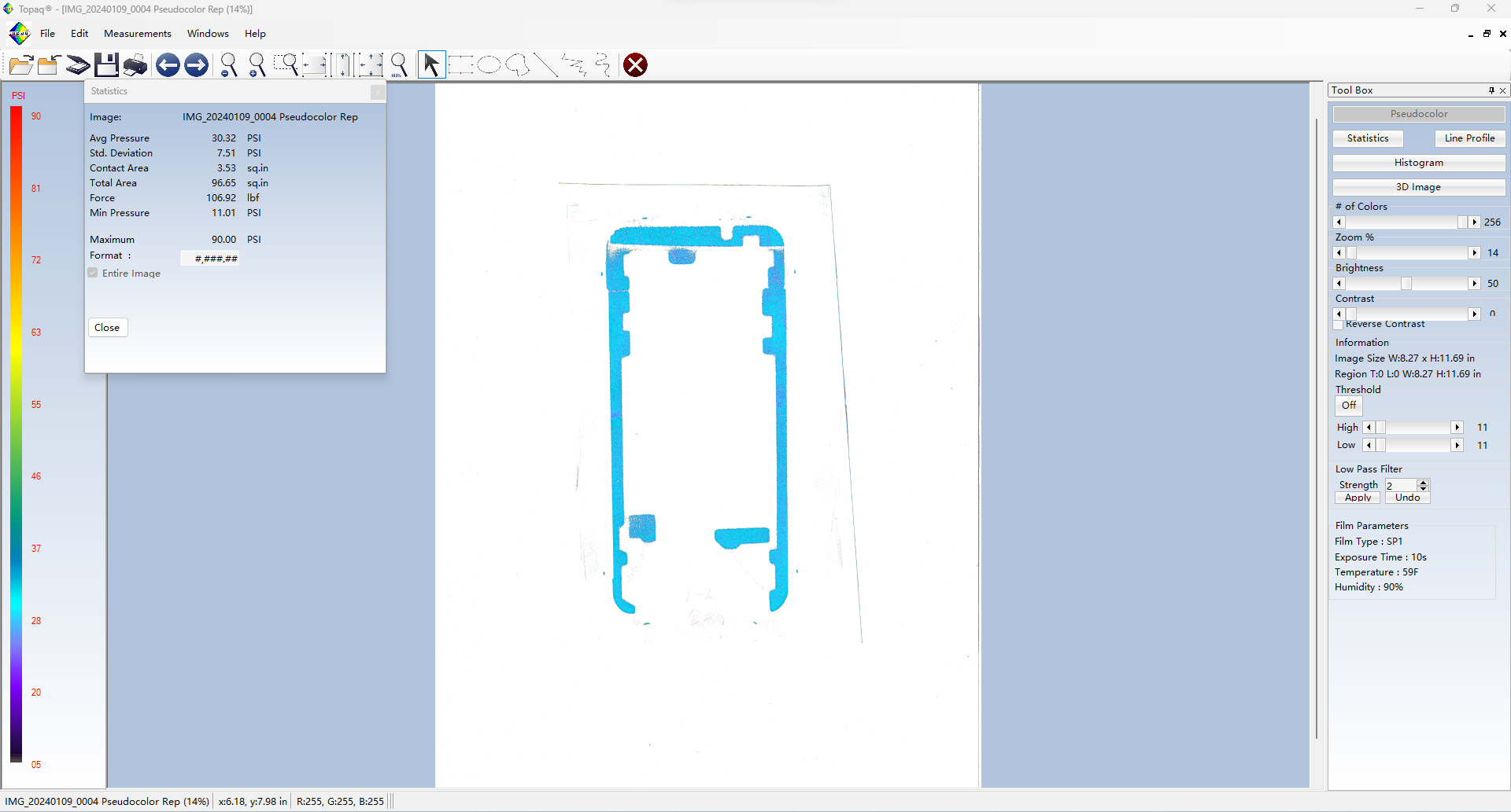 Topaq 感壓紙數(shù)據(jù)分析系統(tǒng):由經(jīng)過特殊校準(zhǔn)的密度掃描儀和Windows軟件組成。通過掃描壓敏紙上的圖像可以在軟件里量化成具體的數(shù)據(jù)值,可以將壓敏紙呈現(xiàn)的圖像轉(zhuǎn)換成3維圖像。并可以根據(jù)色階區(qū)分力值大小。